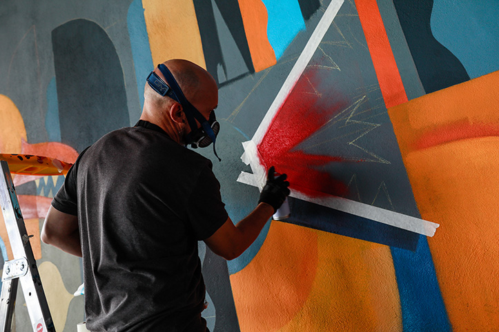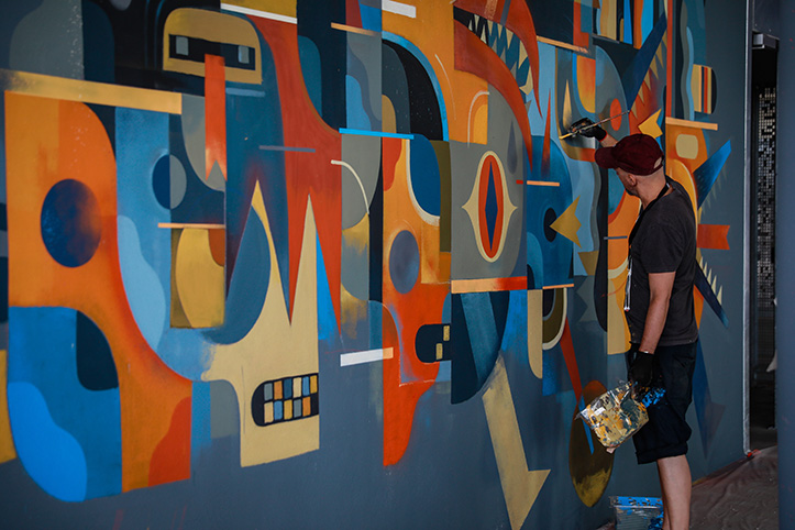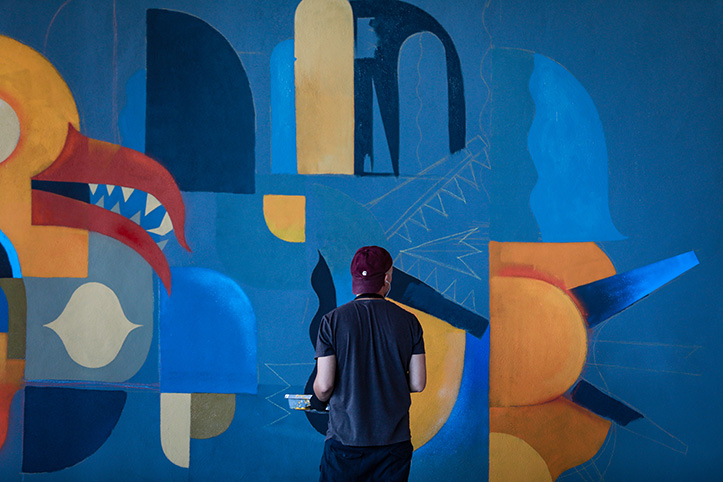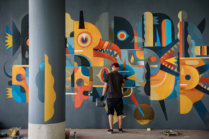 Partant d’une composition rythmée par des formes de couleurs abstraites, Niark1 a assemblé plusieurs personnages issus de son bestiaire. Crânes, robots, monstres hybrides et animaux loufoques se chevauchent et s’entremêlent dans un joyeux tohu bohu. Cet attroupement, pouvant rappeler les groupes de supporters qui se meuvent, semble se diriger vers l’intérieur du stade dans une ferveur communicative. Les couleurs vives et les effets de textures finissent d’apporter vibration et mouvement à la scène.