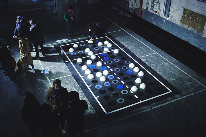 Jeune artiste Nantais, The Blind développe sa propre écriture artistique en utilisant le braille à l’échelle urbaine. En reprenant les codes du terrain de basket, l’artiste a imaginé une installation ludique et interactive. Le public, invité à se saisir de demi-sphères en ballon et à les manipuler, a ainsi pu constituer ses propres messages en braille.