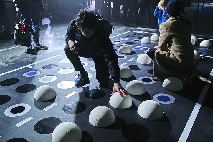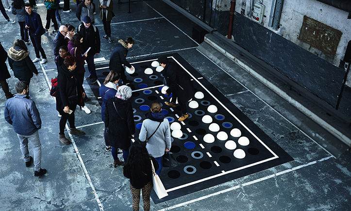 Jeune artiste Nantais, The Blind développe sa propre écriture artistique en utilisant le braille à l’échelle urbaine. En reprenant les codes du terrain de basket, l’artiste a imaginé une installation ludique et interactive. Le public, invité à se saisir de demi-sphères en ballon et à les manipuler, a ainsi pu constituer ses propres messages en braille.