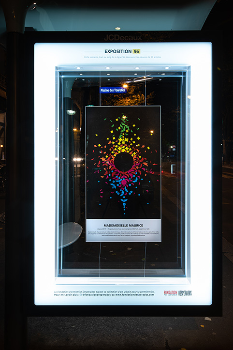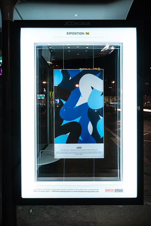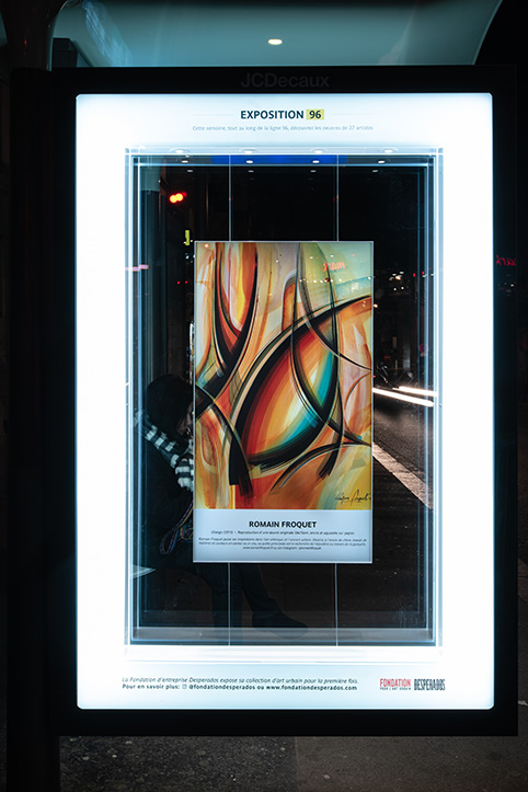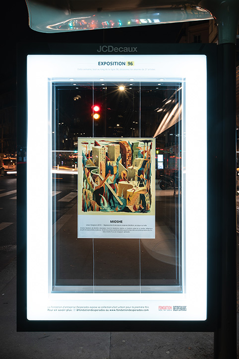 À l’occasion de son lancement, la Fondation Desperados pour l’art urbain propose au grand public de découvrir une partie des œuvres de sa collection à travers une exposition insolite sur les abribus parisiens, le long de la ligne 96.